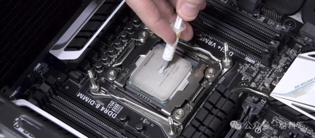 导热膏对产生热量的电子元器件和电子装置提供了极佳的导热效果,具有广泛的适应性,可用于微波通信、微波传输设备、微波专用电源等各种微波器件及晶体管、中央处理器、热敏电阻、温度传感器等。图4所示为辅助中央处理器散热的导热膏。除可以导热外,导热膏还能起到防潮、防尘、减震等作用。