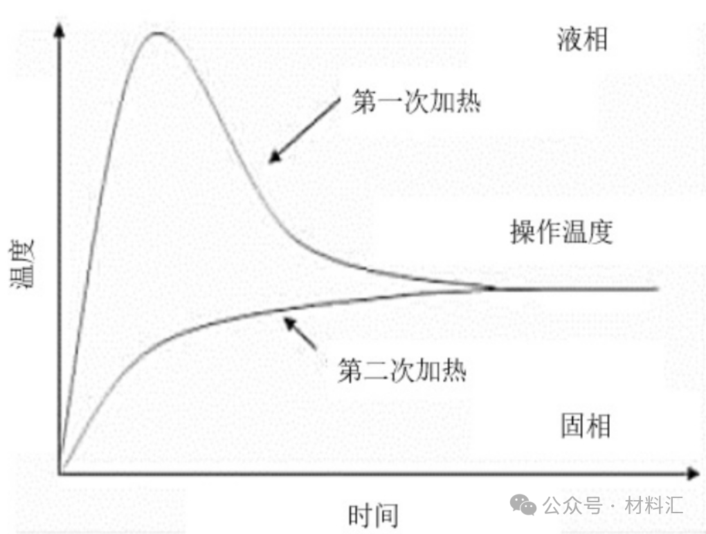 相变材料结合了导热膏和导热垫片各自的优点:电子元器件在刚开始运行时温度比较低,低于相变材料的熔点,此时相变材料为与导热垫片相似的固态,具有良好的弹性和恢复性,装配容易且不会出现被挤出的现象。随着发热元器件的工作运行,温度迅速升高,当超过相变材料的熔点时,相变材料开始熔融,由固态变为可流动状态,从而浸润部件与热沉(或电路卡组件)之间的界面,像导电膏一样尽可能地填充所有空隙,进而减少材料界面间的接触热阻。浸润之后,发热元器件恢复到正常工作温度,相变材料恢复固态。图8所示为相变材料温度随时间变化的曲线。