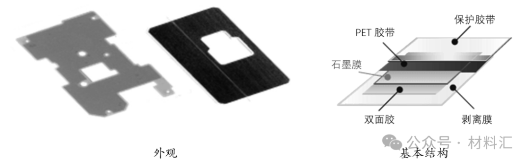 松下(Panasonic)开发的柔性热解石墨膜(Pyrolytic Graphite Sheet,PGS)已经实现大规模量产,该石墨膜由石墨片和高导热性树脂复合,热导率可达700~1950W/(m·K),柔软易加工,仅需粘贴膜状产品即可起到散热效果,该产品外观及基本结构如图13所示。
