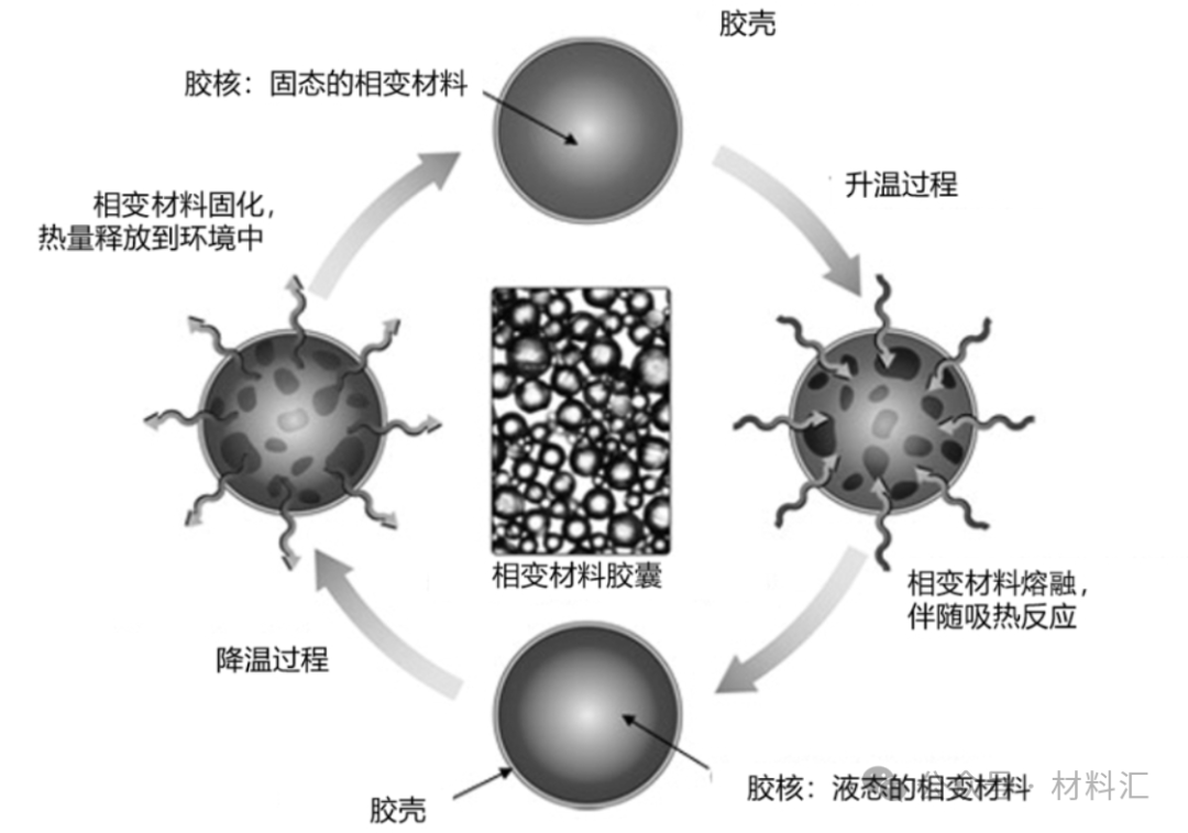 相变材料的工作原理如图7所示。相变材料利用固-液相变特性,通过填充物的改性来提高热传导特性,实现热管理功能。