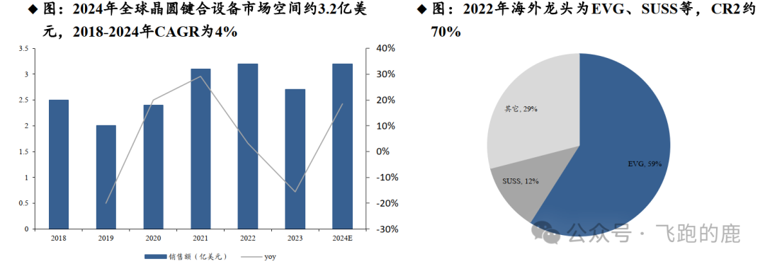 2024 年全球晶圆键合设备市场约 3.2 亿美元,2018-2024 年 CAGR 4%;消费市场集中在中、日、欧美等,2024 年亚太占 60%,欧美各 15%。市场集中度高,2022 年 EVG、SUSS CR2 约 70%(EVG 占 59%、SUSS 占 12%);国外临时键合机单台 2000 万、解键合机 1000 万、混合键合机 3000 万人民币。