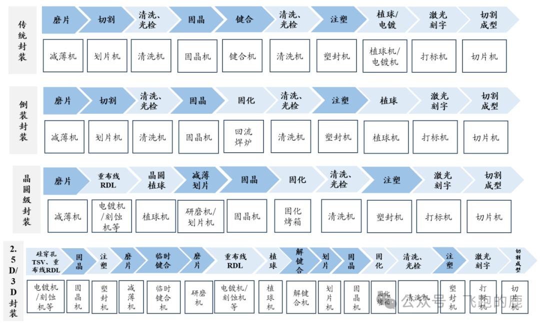 传统封装和先进封装的设备有不少重合,减薄机、划片机、固晶机、键合机、塑封机这些都是两者的标配。