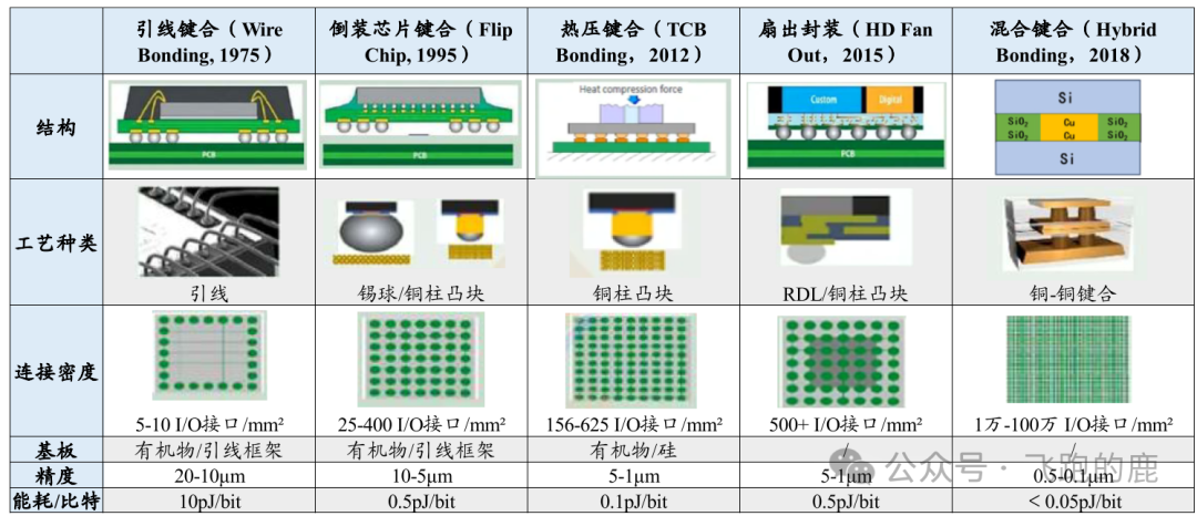 封装形式演变推动键合技术追求更小互联距离与更快传输速度,技术从引线框架发展至倒装(FC)、混合键合等,混合键合精度提升至 10k+/mm²、0.5-0.1um,能量 / Bit 缩至 0.05pJ/Bit。