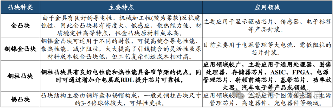 它在 FC、WLP 这些先进封装里用得特别广。经过多年发展,做凸块的金属材质主要有金、铜、铜镍金、锡这几种,不同的金属材质,对应适配不同芯片的封装需求。