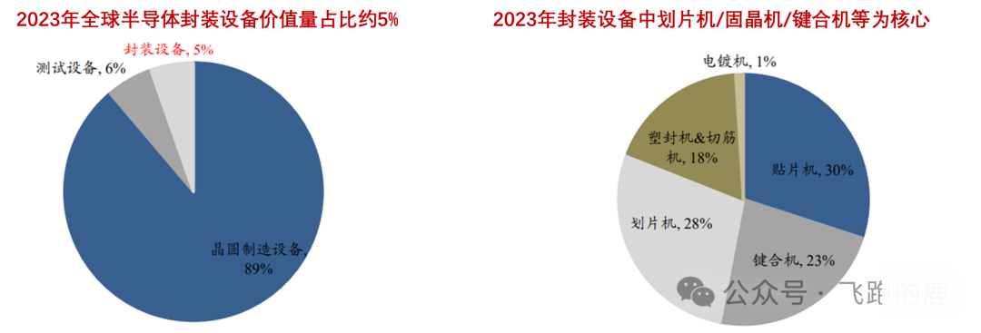 2023 年,后道封装设备在整个半导体设备的价值占比里约为 5%,其中固晶机、划片机、键合机是这一领域的核心设备。
