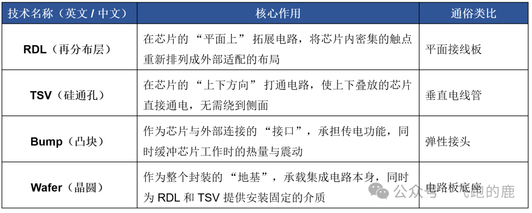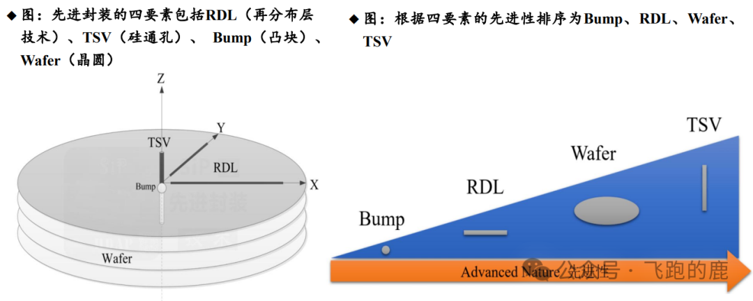 只要一款封装具备这四个要素中的任意一个,就能被称作先进封装,且各要素分工明确。