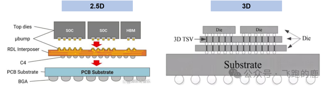2.5D TSV:得靠中介层(Interposer)才能实现连接,相当于需要一块 “转接板” 来搭桥。最典型的应用就是台积电的 CoWos 封装技术,很多高端芯片都用这种方案。