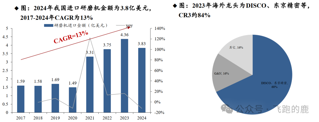 市场方面,2024 年我国进口研磨机金额 3.8 亿美元,2017-2024 年 CAGR 13%;全球减薄设备由日本企业主导,CR3 达 84%,DISCO 份额最高。设备端,日本 DISCO、东京精密单台减薄机约 1200 万人民币且全自动化;国内厂商少(如郑州第三研磨所、华海清科等),国产设备价格相当,单台年产能约 6 万片,具体与实际研磨量相关。