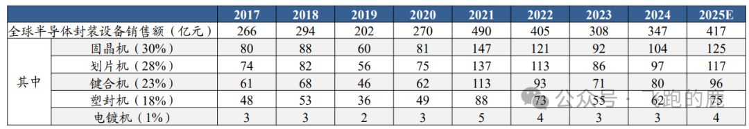到 2025 年,全球半导体封装设备的市场规模大概率能达到 417 亿元;具体看设备占比,固晶机(也叫贴片机)占 30%,划片机(也叫切片机)占 28%,键合机占 23%,这三类核心设备的占比加起来超过八成。