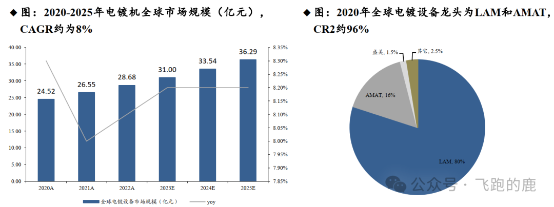 目前,2023 年全球晶圆电镀设备市场规模约 31 亿元,2020-2025 年 CAGR 约 8%;据 Gartner,2020 年该市场以国外企业为主,美系 LAM 和 AMAT 合计占 96%(LAM80%、AMAT16%),盛美上海仅占 1.5%,且前道市场由 LAM 垄断,后道主要是 AMAT、LAM 等国外企业,国内盛美半导体较领先。