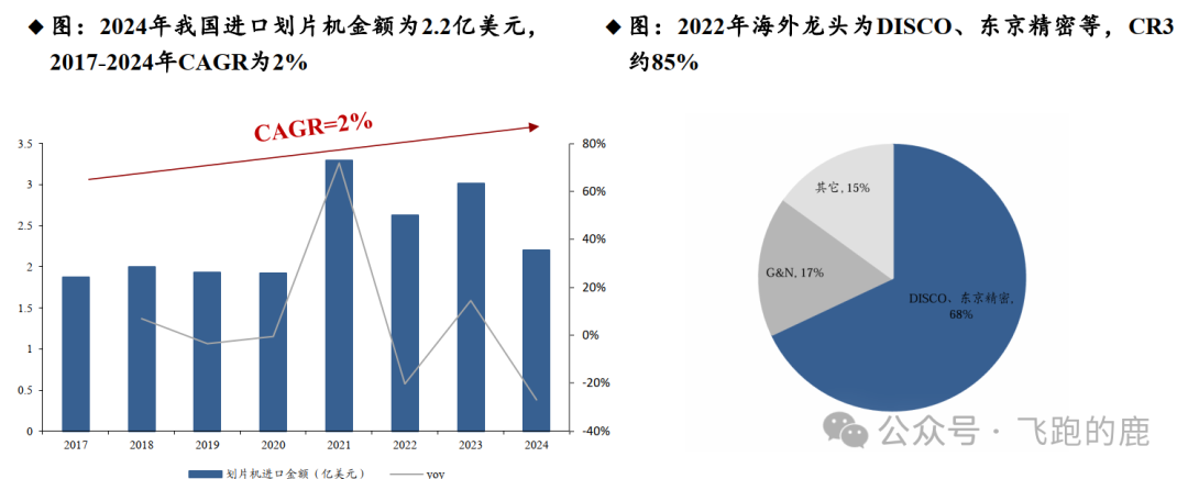 市场上,2024 年我国进口划片机金额 2.2 亿美元,2017-2024 年 CAGR 2%;全球市场由日本企业主导,2022 年 CR3 约 85%,DISCO 份额最高。